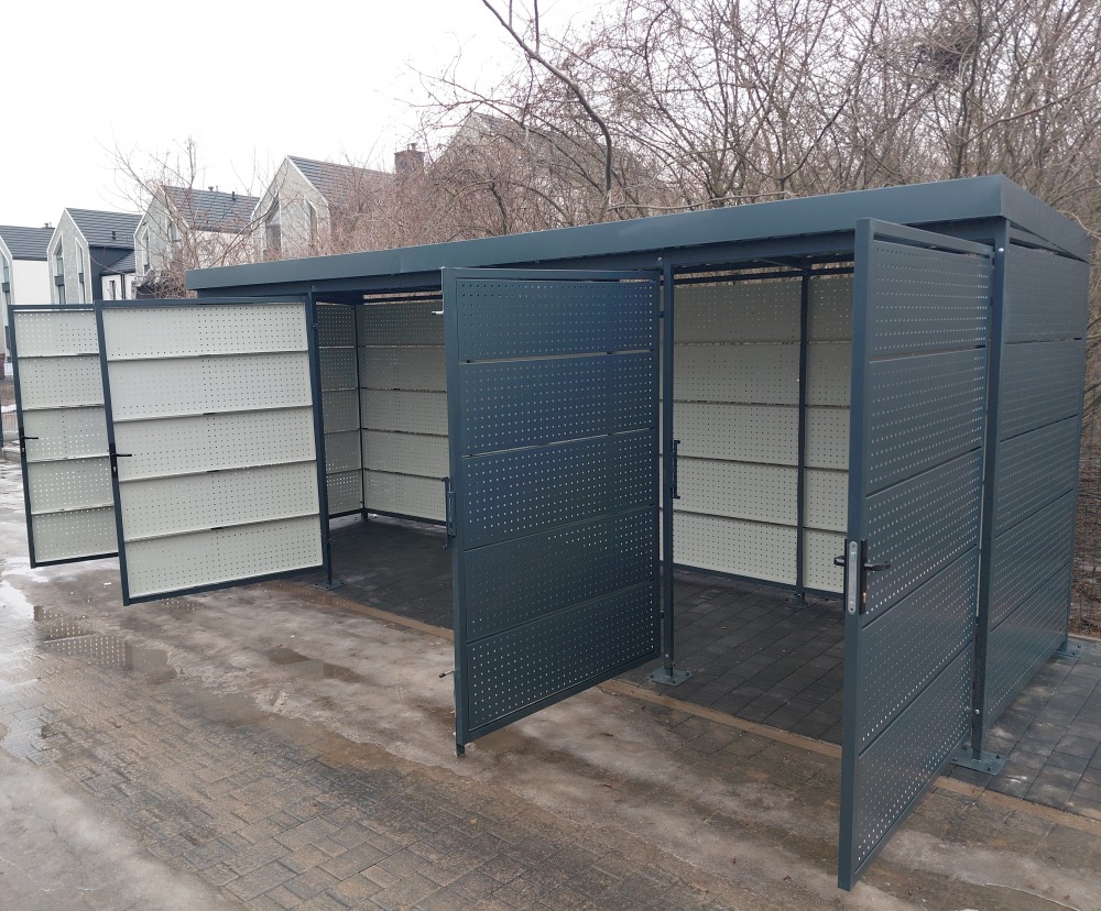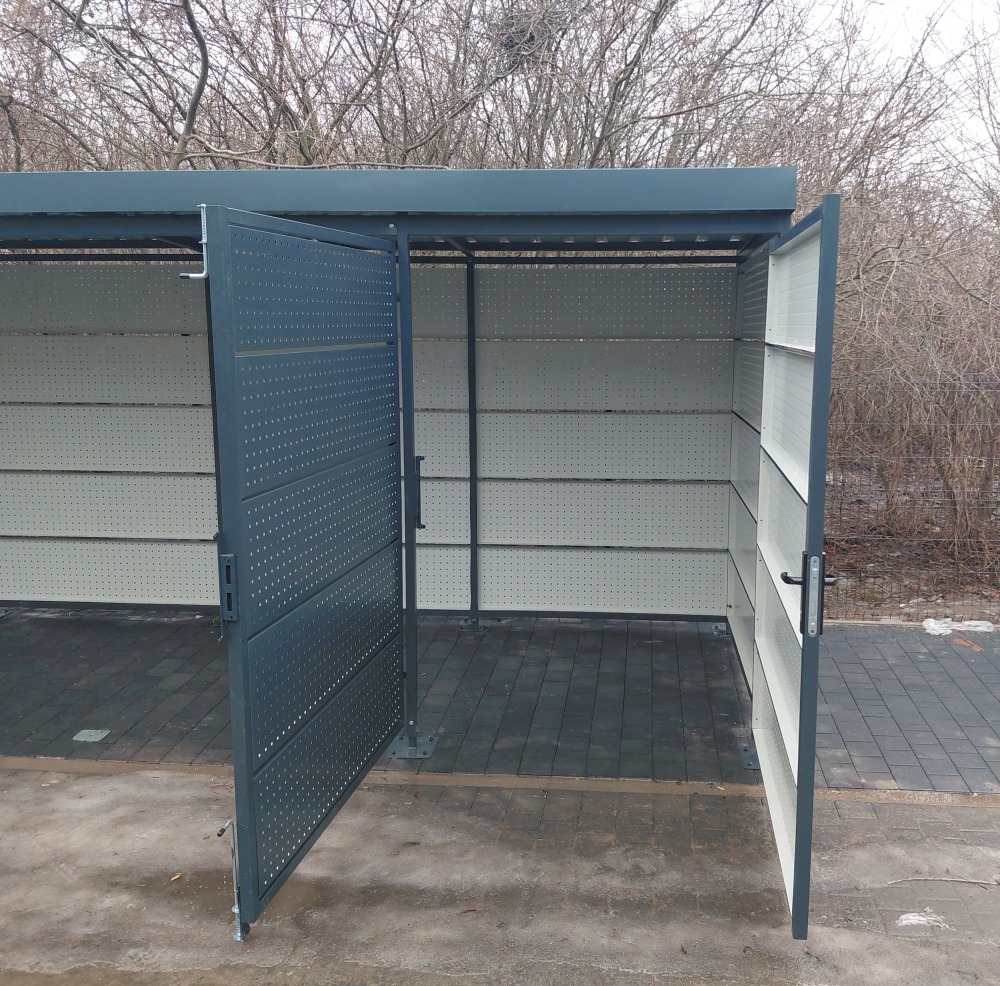 Model 01 to solidna wiata o konstrukcji wykonanej z zamkniętych, ocynkowanych profili stalowych, zapewniających trwałość oraz odporność na warunki atmosferyczne. Ściany wiaty wykonane są w całości z blachy perforowanej, co zapewnia bardzo dobrą wentylację oraz nowoczesny wygląd konstrukcji.Dach wiaty pokryty jest blachą trapezową T18, gwarantującą skuteczne odprowadzanie wody oraz wysoką wytrzymałość. Kierunek spadku dachu może być dostosowany do indywidualnych potrzeb użytkownika.