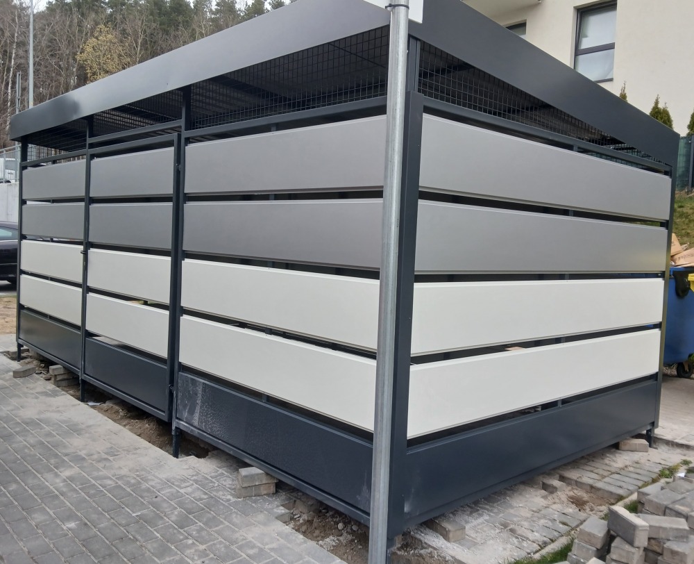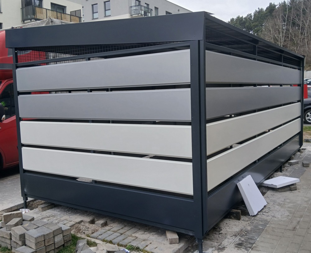 Model 02 to wytrzymała wiata oparta na konstrukcji z ocynkowanych profili stalowych. Ściany wykonane z powlekanych paneli stalowych nadają jej estetyczny wygląd oraz zapewniają trwałość w codziennym użytkowaniu.Dach z blachy trapezowej skutecznie odprowadza wodę, a kierunek jego spadku można dopasować do warunków zabudowy.